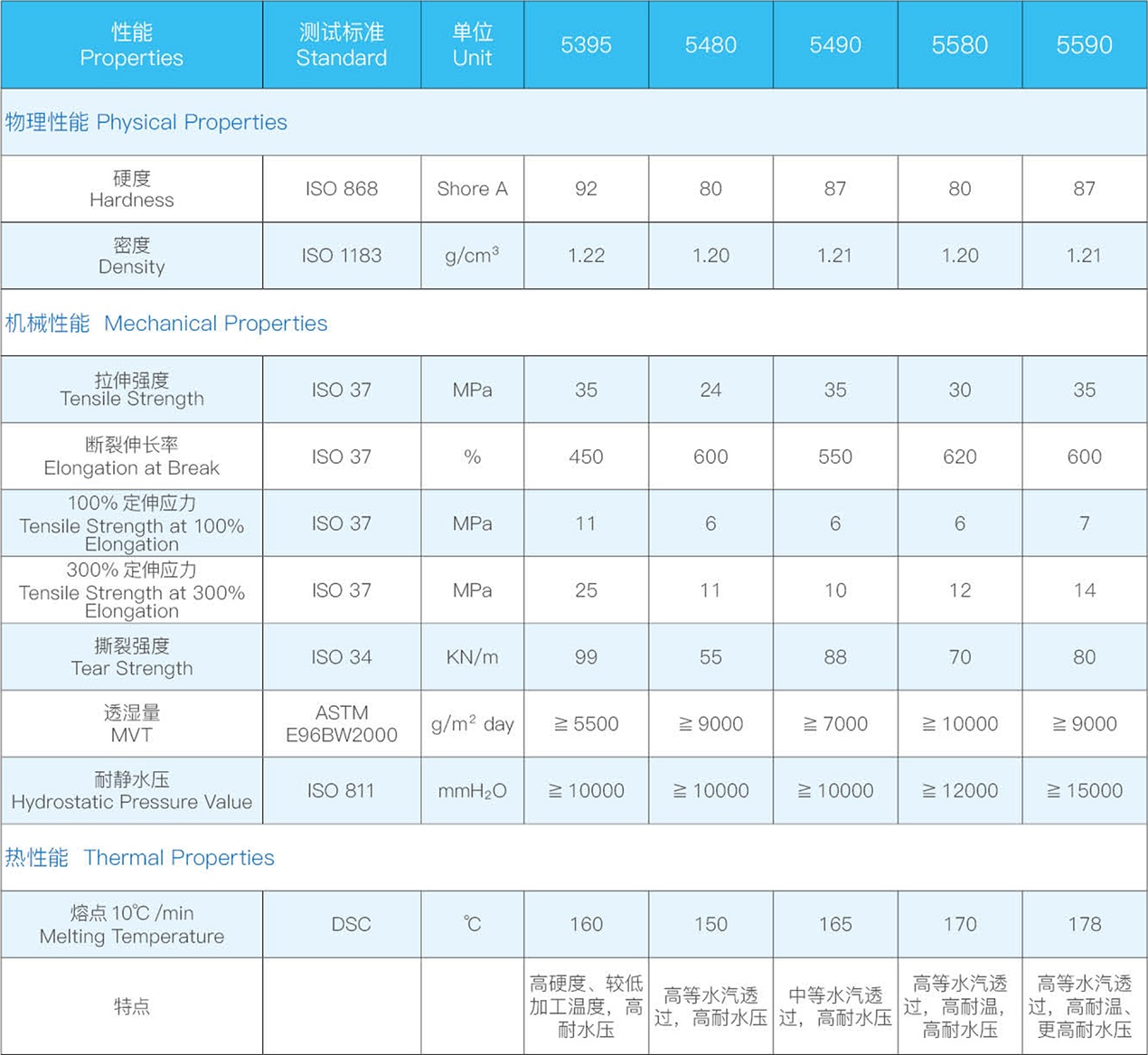 Water vapor transmission, high water pressure resistance, washing resistance, high temperature resistance;
